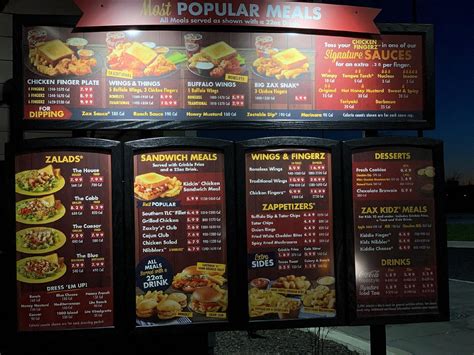 Zaxbys Menu Wings. This article gives you complete zaxby’s menu. At zaxby’s, they serve 6 finger/wings meals, 7 sandwich meals, 2 salads, 2 kids meals,.